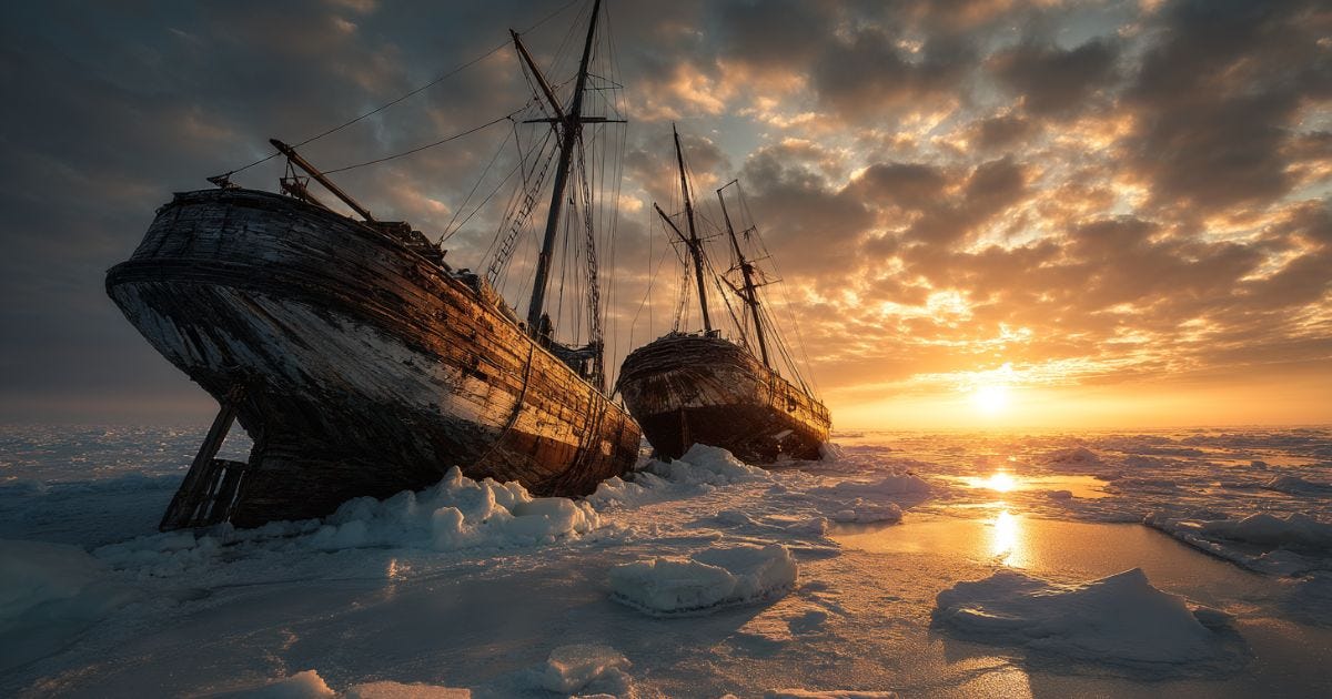 In May 1845, two ships — HMS Erebus and HMS Terror — set sail from England under the command of Sir John Franklin. Their mission was to chart the elusive Northwest Passage. On board were 128 officers and crew, a mix of seasoned sailors and young adventurers. By July 1845, whalers in Baffin Bay sighted the ships — the last time Europeans would ever see them afloat.